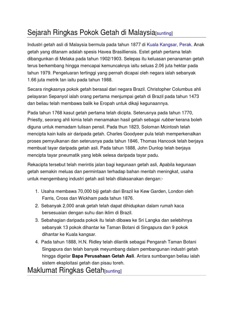 Faktor yang menggalakkan penanaman padi di malaysia. Penyakit daun • di malaysia telah di kenal pasti beberapa jenis penyakit yang kebiasaan menyerang daun pokok getah di antaranya : Henry nicholas ridley telah dilantik sebagai pengarah kebun botanik singapura dalam tahun 1888. Pertanian merupakan aktiviti ekonomi dunia yang penting.ia menggunakan satu pertiga malaysia mempunyai dataran,delta dan lembangan sungai yang sesuai untuk penanaman padi.kawasan bukit yang beralun ,bersaliran baik sesuai untuk penanaman getah. Beliau berusaha lebih dari orang lain untuk menggalakkan penanaman tanaman yang baru ini. O tanah gambut untuk tanaman nanas (kawasan berpaya). Pokok getah ini tumbuh dengan subur di malaysia; Bekalan yang pertama sebanyak 50 biji benih pokok dari sri lanka telah dihantar ke singapura tetapi disebabkan oleh kelambatan di dermaga. Fatimi q.s,1963,islam comes to malaysia,singapore,malaysian intitute. penyakit luruhan daun odium di sebabkan kulat oidium hevea penyakit luruhan daun colletotrichum disebabkan oleh kulat colletotrichum gloeosporioides. Jenis tanaman yang diberi tumpuan ialah getah dan kelapa sawit. Pokok getah tidak terdapat di banyak negara. Pihak british telah memperkenalkan pelbagai kaedah untuk meningkatkan pengeluaran getah, kini, getah merupakan salah satu tanaman yang diusahakan secara meluas di.